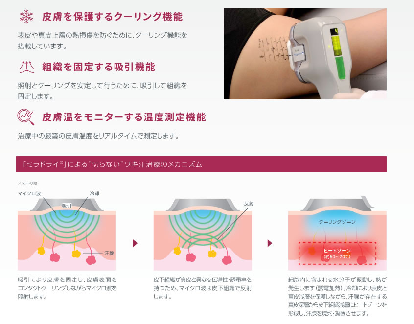 独自のテクノロジーにより、表皮を冷却保護しながら汗腺が存在する領域を加熱することで非侵襲的なワキ汗治療を可能にしました。